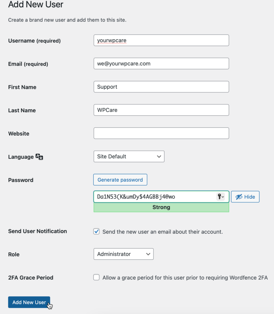 During the troubleshooting or issue resolution process, there might be instances where we need access to your WordPress dashboard. This area allows you to log in to WordPress and manage your content and settings. To proceed securely and efficiently, please follow the steps below to create a new user account with administrative privileges for our team.